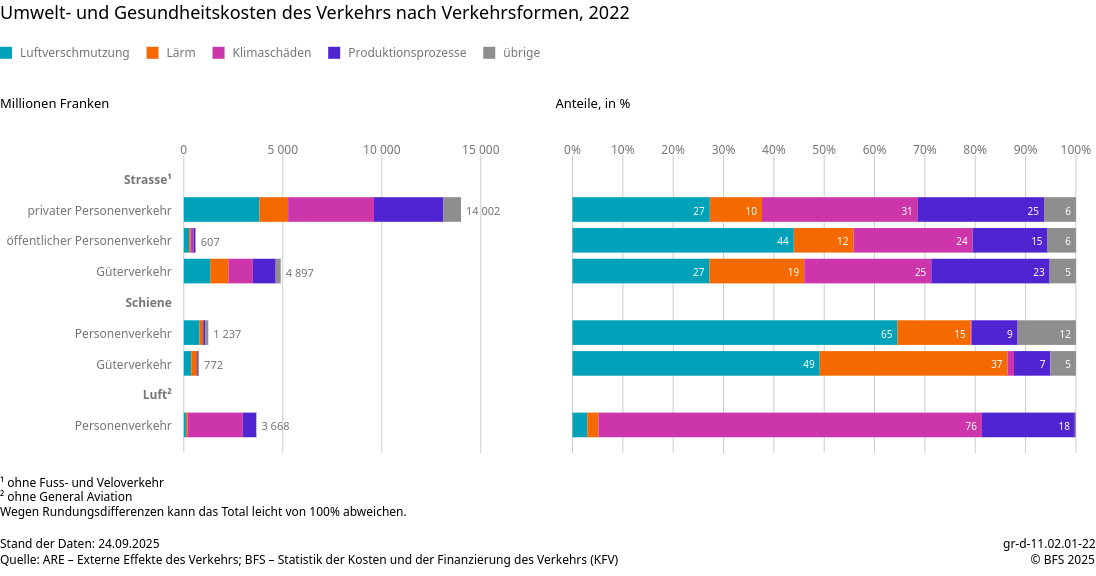 Der Personenverkehr auf der Strasse ist für über ein Viertel der Treibhausgasemissionen und einen grossen Anteil der Feinstaub- und Lärmbelastung verantwortlich. 13.5 % der Menschen in der Schweiz sind grenzwertüberschreitendem Strassenlärm ausgesetzt (4).